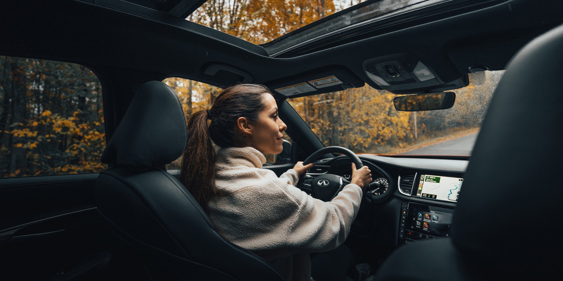 Ambiance abounds inside QX50 courtesy of its available panoramic moonroof with power sunshade, creating an in-cabin experience that's both bright and airy at once.